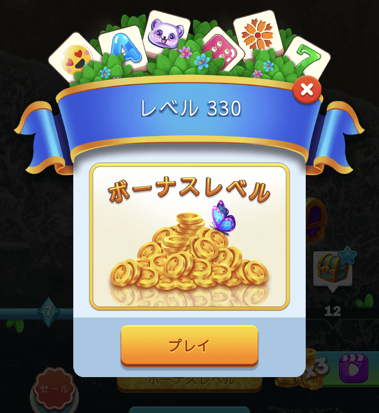 ボーナスレベルは時間制限がありますが、とても簡単なレベルです。全てのタイルを消せなくてもクリア判定となります。
