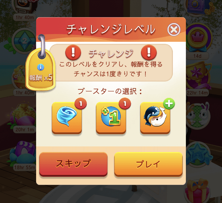 チャレンジレベルはとても難しいですが、報酬が5倍のレベルです。
